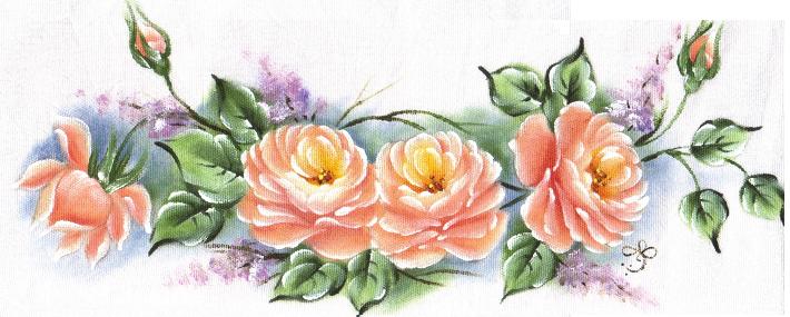 Sombreado em azul inverno e verde grama , folhas em verde grama , verde pântano e branco, rosas em base de pêssego , sombras em caramelo e vermelho fogo , luzes em branco , miolo em amarelo ouro e caramelo.Avencas em rosa ciclame, magenta e branco , galhos em verde pântano , sépia e branco.